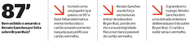 Renato Sanches agride barbaramente Bryan Ruiz e leva apenas amarelo. Por acumulação de amarelos, fica de fora do próximo jogo. Ora, se levasse o vermelho directo ficaria de fora pelo menos dois jogos por agressão e quando voltasse a jogar continuaria "à bica" para nova suspensão. Nos 9 últimos jogos falharia 3. Como o "apito" é amigo falha um jogo até ao final da época e está arrumada a questão.