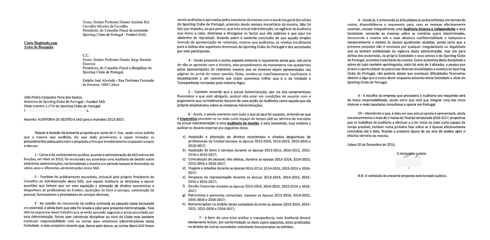 No dia 20 de Dezembro de 2016, João Pedro Paiva dos Santos enviou uma carta dirigida ao Presidente do Conselho Fiscal da Sporting SAD e ao Presidente do Conselho Fiscal e Disciplinar do Sporting Clube de Portugal. Nessa carta, o sócio e accionista pediu a estes órgãos uma auditoria de gestão ao mandato de Bruno de Carvalho.
