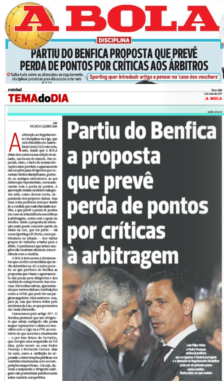 Estou até profundamente convicto que o Benfica concordará com estes processos e os respectivos castigos, não fossem eles os autores de uma proposta apresentada em Maio de 2017, que visava punir os clubes com a perda de pontos por criticas à arbitragem. Por essa altura o Benfica tinha "os padres que escolhemos e ordenamos nas missas que rezamos, temos é de rezar e cantar bem", daí que havia o interesse em condenar os que eram prejudicados pelos apitos divinos.