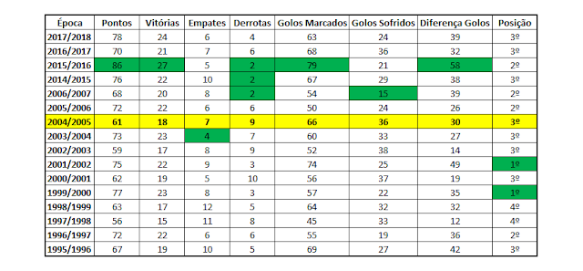 Como podem verificar, nestas 16 épocas o registo pontual de José Peseiro é apenas e só o 14º melhor. Em termos pontuais o Sporting só fez pior do que os 61 pontos de 2004/2005 em 2002/2003 - 59 pontos e em 1997/1998 - 56 pontos.