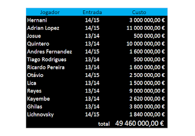 O que é certo é que lá se foram 41,7 Milhões. E ainda há que somar a contratação de Franco Cervi, apesar de só chegar na próxima época (5,6 Milhões). Já vamos nos 47,2 M... e ainda há os milhões gastos em Carrillo...