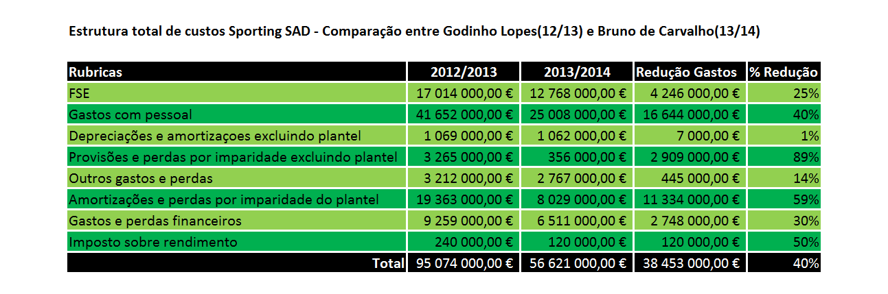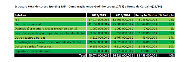 Como podem verificar, o Sporting por via de uma politica de contracção financeira tendo em vista a criação de condições para pagar aos seus credores, de acordo como plano de reestruturação financeira teve que fazer o seguinte: Reduzir os gastos que estavam na casa dos 95 Milhões/Época no tempo de Godinho Lopes para os 56 Milhões/época. São 38,5 Milhões a menos. Menos 40%.